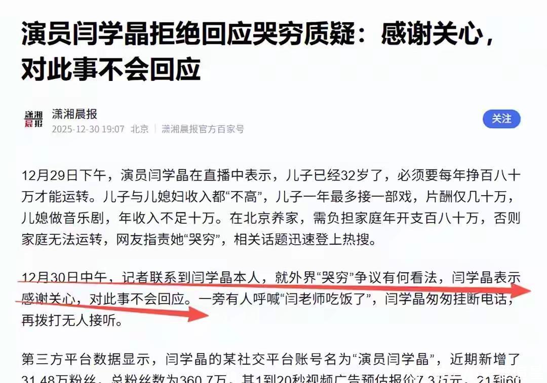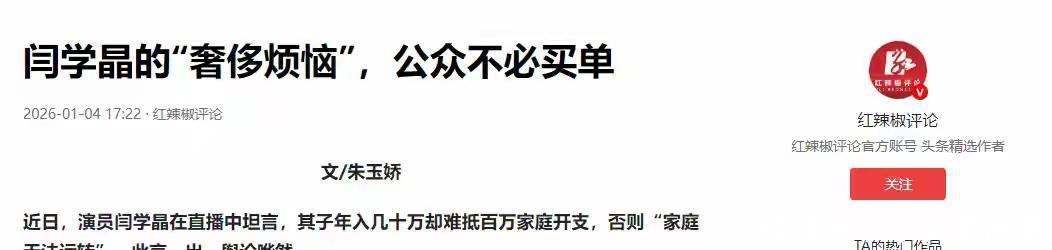 这一场风波, 就像一堂公开课。它清楚地告诉所有人, 尤其是那些站在聚光灯下的人:观众手里握着的, 不只有鲜花和掌声, 还有衡量是非对错的尺子。这把尺子, 量的是言行, 更是人心。参考信源:潇湘晨报 (2026日) 《闫学晶直播“哭穷”引争议, 官媒发声》红辣椒评论 (2026日) 《闫学晶的“奢侈烦恼”, 公众不必买单》